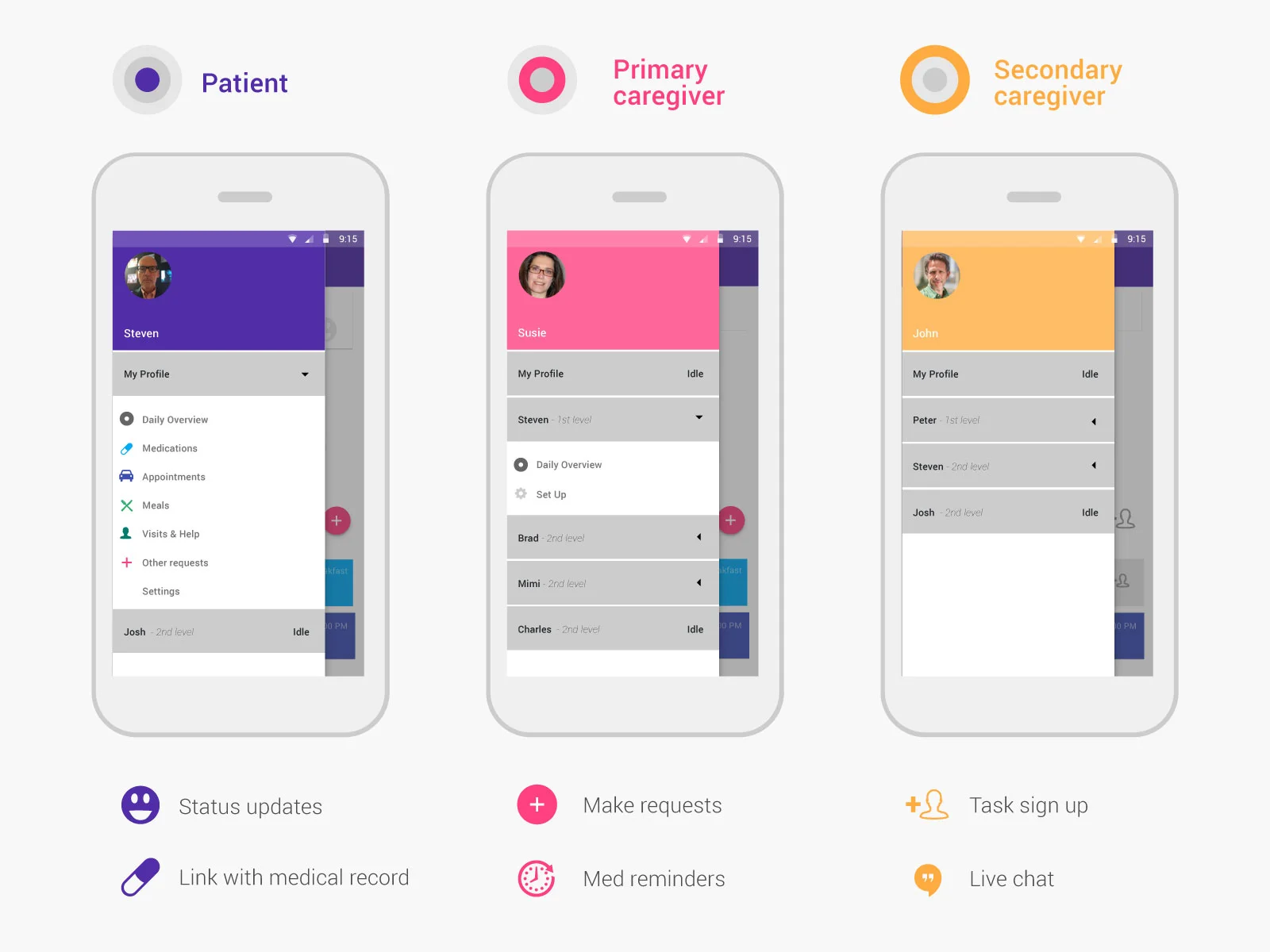 Au cœur de Circle se trouve le patient. L’interface utilisateur du patient permet de définir les besoins de soins et les routines, ainsi que d’établir les relations avec les aidants. Un patient peut consulter son agenda quotidien, recevoir des rappels pour des événements programmés tels que des rendez-vous ou la prise de médicaments, enregistrer des informations comme les repas ou la prise de médicaments – et surtout, faire appel à son cercle de soins via l'application pour demander de l’aide. Ces demandes peuvent être logistiques, comme un transport chez le médecin ; liées au confort, comme une friandise, ou émotionnelles, comme simplement de la compagnie à la maison. L’application vise à rapprocher les proches, selon les besoins.